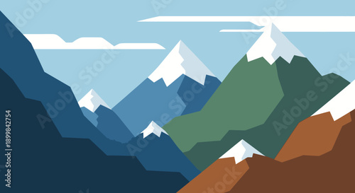 Colorful Stylized Mountain Range Landscape with Peaks and Valleys under a Clear Sky.