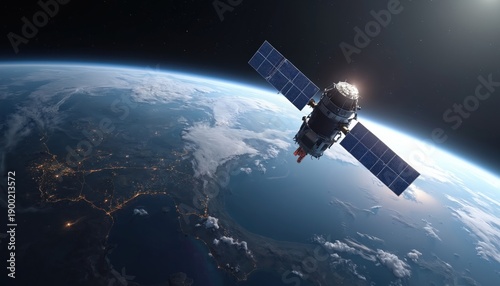 Artificial satellite orbits Earth, provides global communication and navigation services. Tech in space transmits data for GPS, weather, and internet access. Spacecraft operates in orbit.