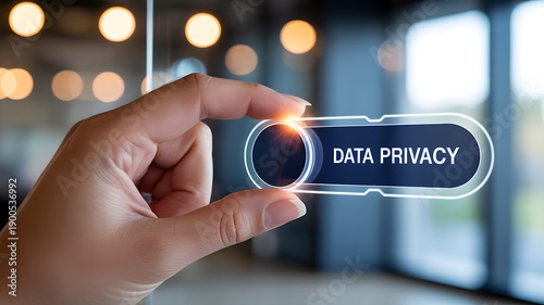 Hand pressing glowing digital button labeled DATA PRIVACY symbolizing security and information protection