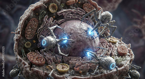 Cross section view of a cell nucleus being treated by internal nanobots