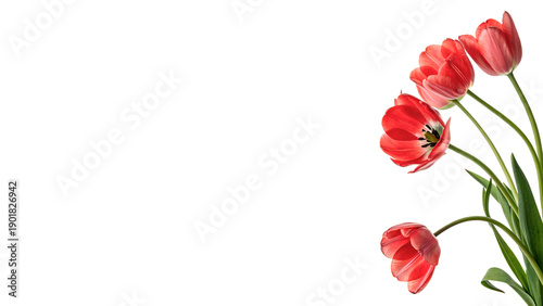 Several red tulips stand upright with green stems isolated on transparent background cut out