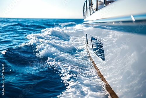 Elegant private yacht with spacious upper deck and smooth contours, surrounded by gentle waves