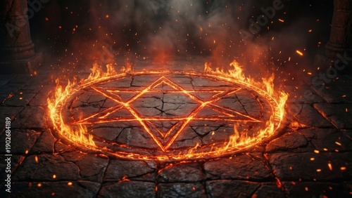 Glowing infernal pentagram carved in cracked stone, surrounded by fire and smoke, dramatic occult ritual background for horror themes.