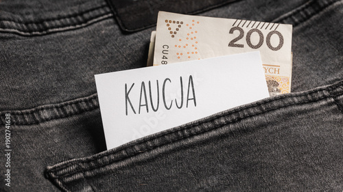 White card with a handwritten inscription "Kaucja", inserted into the pocket of gray pants jeasnow, next to Polish banknotes PLN (selective focus)