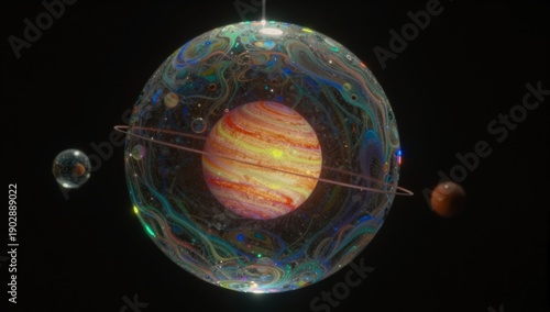 Abstract planet with swirling cosmic energy gaseous rings and distant celestial bodies