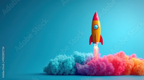A colorful rocket launches from vibrant clouds of pink and blue smoke against a bright turquoise background, symbolizing creativity and exploration.