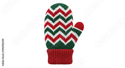 Knitted Mitten with Red, Green, and White Chevron Pattern
