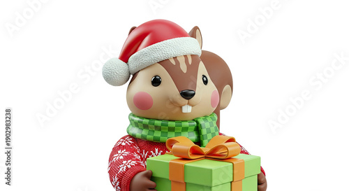 Cute Squirrel Character in Santa Hat Holding Christmas Gift