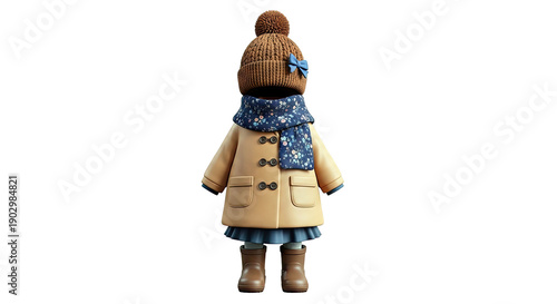 Children's winter outfit with coat, hat, scarf, skirt, and boots