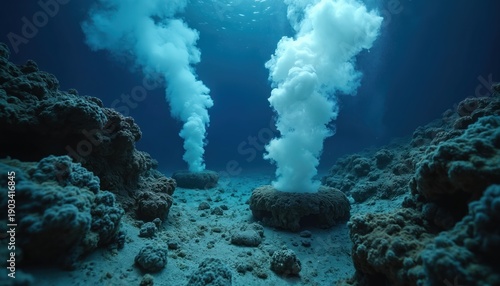 Deep ocean floor with volcanic hydrothermal vents emitting white steam plumes. Rocky seabed with dark underwater landscape. Marine geological activity shown.