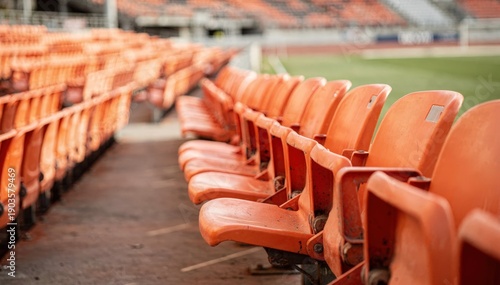 Focused medium shot of upper deck rows bright orange seats sharply contrasted against a blurred background of the stadiums partial playing field.