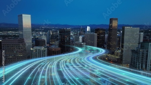 Modern American smart city with skyscrapers and digital animation showing business digitalization and new era of entrepreneurship