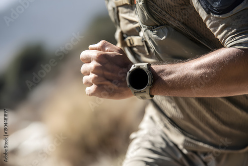 Trail Runner Wearing Rugged Smartwatch In Outdoor Terrain