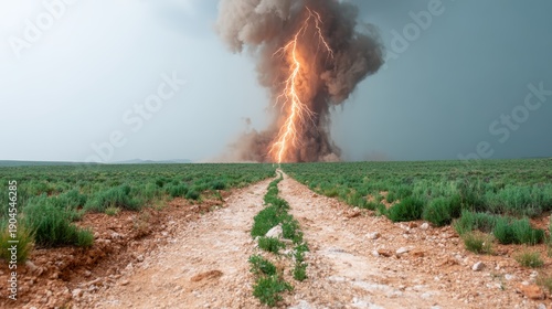 A powerful image of lightning striking in a dramatic storm over a green landscape, capturing the raw energy of nature and the majesty of unpredictability in the environment.