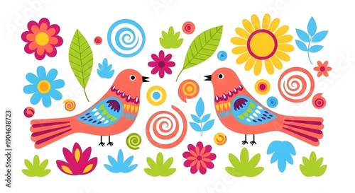Ilustración vectorial en estilo simple dibujado a mano y linograbado - impresión natural, plantilla de diseño de póster o logotipo - ilustración de primavera - pájaros y flores