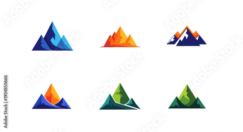 Vibrant Set of Colorful Mountain Icons Depicting Various Peaks and Landscapes, Isolated White Background