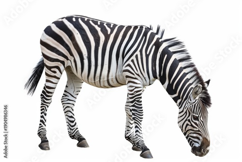 A majestic zebra with striking black and white stripes grazing in a natural setting.