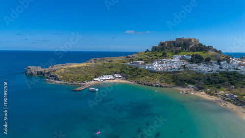 Rhodes, Greece. Lindos small whitewashed village and the Acropolis, scenery of Rhodos Island at Aegean Sea.