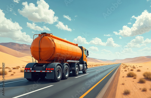 Orange fuel tanker drives on desert highway under bright blue sky with fluffy clouds. Vast arid landscape with sand dunes and sparse dry bushes stretches to the horizon.