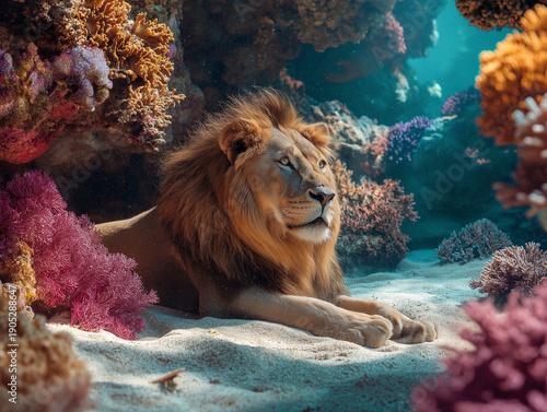 A large lion relaxing in the sand in a colorful coral reef, representing an unusual surreal scene