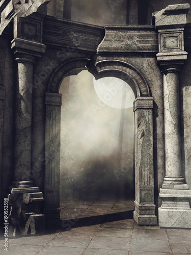 Ruiny bramy zamkowej w lesie na tle księżyca
