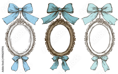 Zestaw trzech ozdobnych owalnych ramek w stylu vintage z niebieskimi kokardami na przezroczystym tle do projektów graficznych.