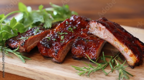 Side angle shot of grilled ribs covered in thick BBQ sauce with golden caramel edges.