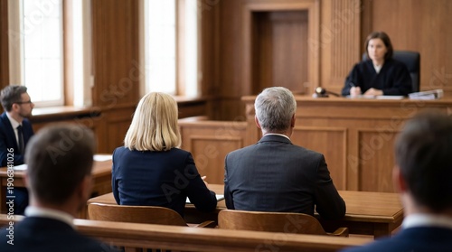 People sitting in a courtroom during a trial with a judge
