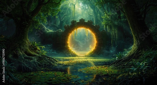Glowing circular entrance set amidst thick woods and marshes magical realism painting
