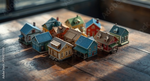 Grouped small-scale houses in different colors representing social classes on table with copy space