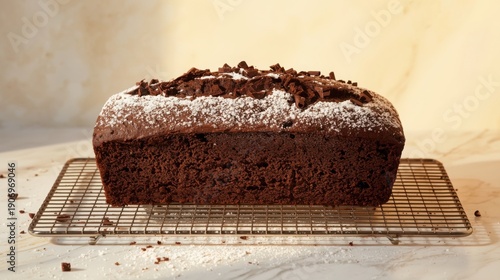 Moist and decadent chocolate pound cake loaf on cooling rack dusted with powdered sugar on top against beige background