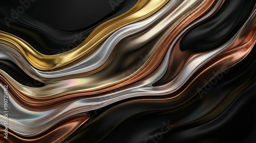 Abstract composition of flowing metallic ribbons in gold, silver, bronze and copper tones with curves, evoking luxury and sophistication for premium design versatility