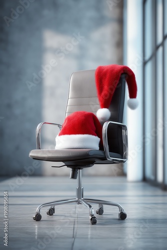 A humorous office scene featuring a Santa hat resting on a swivel chair, perfect for celebrating corporate holiday cheer.