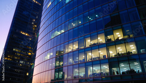 Modern Office Building Exterior at Dusk with Illuminated Windows and Blue Glass Facade