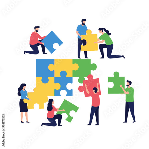 Teamwork puzzle collaboration, people assembling jigsaw pieces, business strategy and solution concept