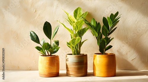 Three potted green plants in terracotta pots on a white surface with a textured wall background.