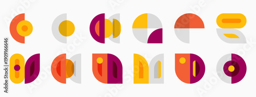 Geometric shapes, circles, rectangles, segments. Warm color palette dominates design. Minimalist aesthetic, flat illustration style.