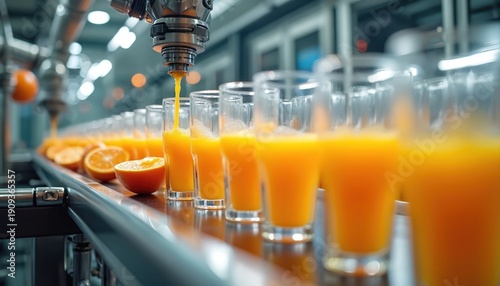 Orange juice fills glasses on automated line. Fresh fruit processing in modern factory. Ripe citruses are squeezed by tech equipment. Natural beverage production.