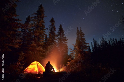 Solitary Campfire in a Starry Forest. Serene Camping Night: Solo Camper by the Campfire Under Starry Sky