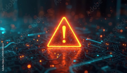 Glowing neon warning triangle with exclamation mark over digital circuit board. Abstract futuristic danger alert signifies system failure or cyber threat. Concept of digital risk emergency.