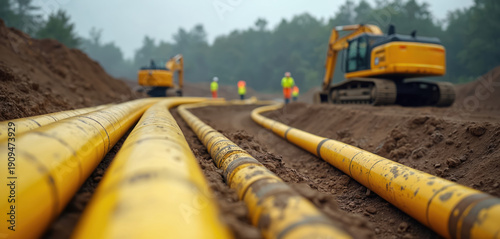 Yellow pipes laid on dirt at construction site. Excavators and workers operate machinery for underground infrastructure project development. Building new road utilities for urban area.