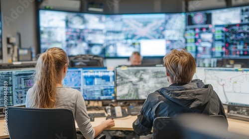Emergency center operator monitoring multiple screens with fast response team coordination, control room, headset, dispatcher, surveillance, command and communication.