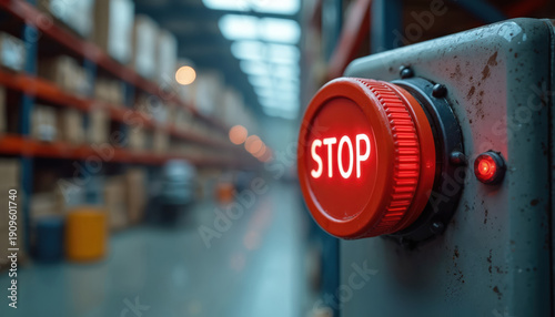 Large red stop button glows on industrial machine in warehouse. Emergency switch for safety control in factory. Halt production process. Factory worker uses button. Automation risk.