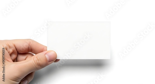 Hand holding blank white business card on white background