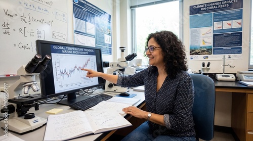 Female marine biologist scientist analyzing global temperature trends climate change data in research laboratory studying coral reef biodiversity ocean warming environmental science