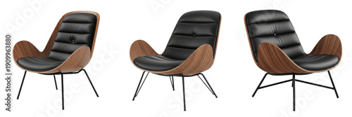 Set of Three Modern Wingback Armchairs with Blue Shell and Tan Leather Cushions on White Background