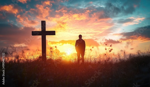 Person silhouette standing beside a wooden cross in a grassy field at sunset, contemplative and peaceful mood beneath a dramatic colorful sky