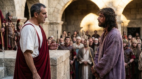 Jesus standing before Pontius Pilate, Pontius Pilate interrogating Jesus. Man in toga speaking to man in robe during historical scene with crowd