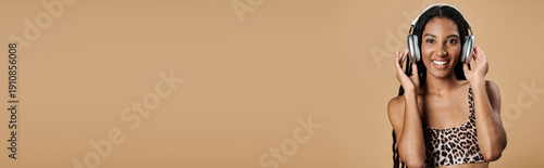 Young fashionable woman wearing headphones enjoys music with a radiant smile in a stylish setting