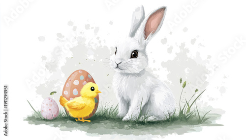 White bunny rabbit, yellow chick, Easter eggshell background, illustration, design
